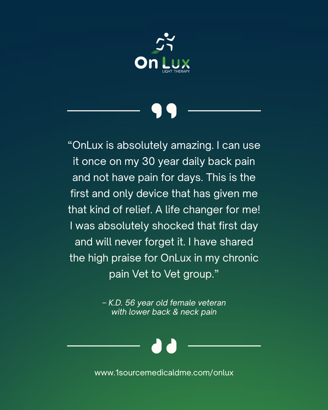 OnLux devices are non‑invasive, drug‑free, and used within the VA to support chronic pain management, wound care, and nerve‑related conditions. Veterans and active military may qualify for coverage depending on their provider’s assessment.